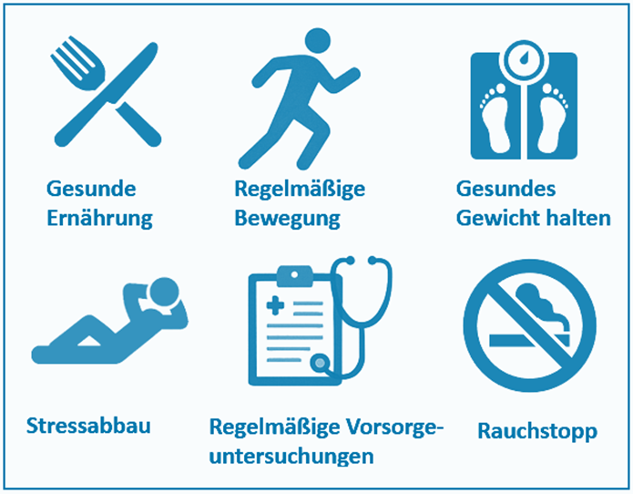 - Basis ist immer Lebensstiländerung (gesunde Ernährung, mehr Bewegung, gesundes Gewicht erreichen und halten, Raucherentwöhnung)